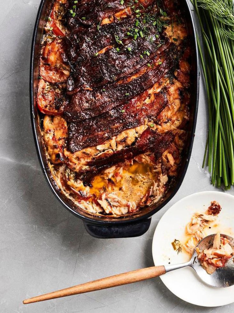 Savulohi yhdistyy vastustamattomalla tavalla tuoreeseen tomaattiin, pekoniin sekä ruohosipuli- ja tillisilppuun. Uunissa maut hautuvat suussa sulavaksi kokonaisuudeksi.