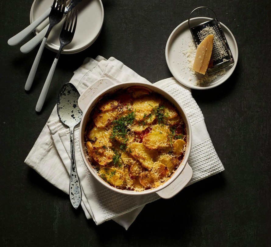 Kaada kermaseos vuokaan ja ripottele pinnalle parmesaaniraaste. Paista noin tunti.