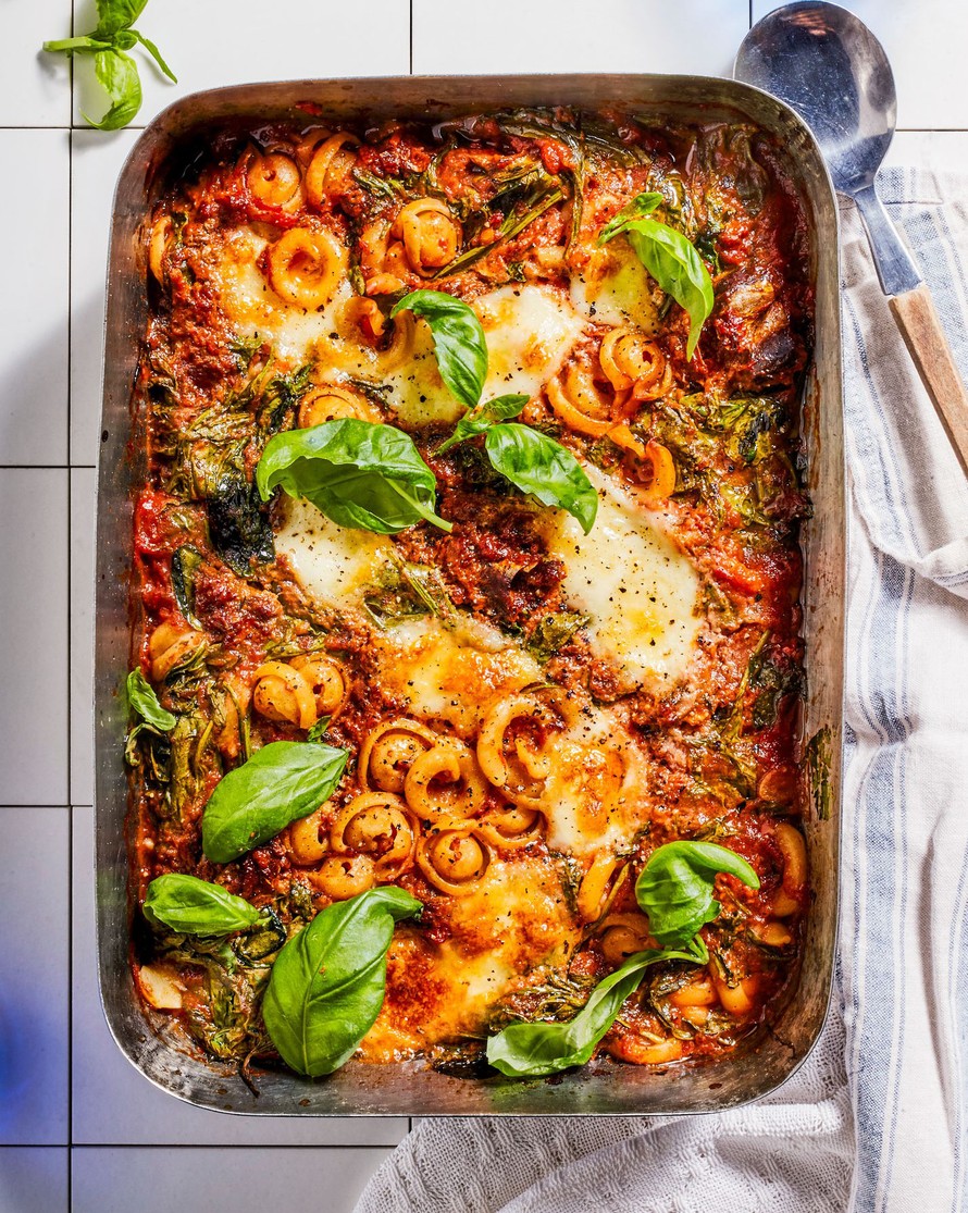 - Kypsennä 225-asteisen uunin keskitasolla noin 35 minuuttia, kunnes pasta on kypsää. Viimeistele hienonnetulla basilikalla.