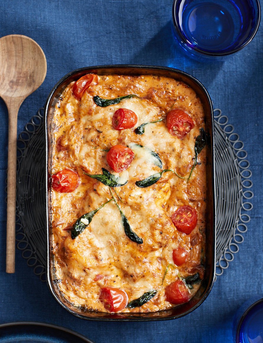 - Lisää uunivuokaan lasagnelevy. Lisää päälle pinaattia, kirsikkatomaatteja ja kolmannes kastikkeesta. Jatka näin kolme kerrosta.