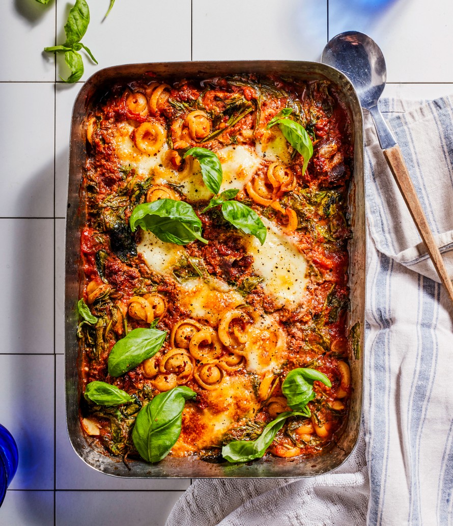 - Kypsennä 225-asteisen uunin keskitasolla noin 35 minuuttia, kunnes pasta on kypsää. Viimeistele hienonnetulla basilikalla.