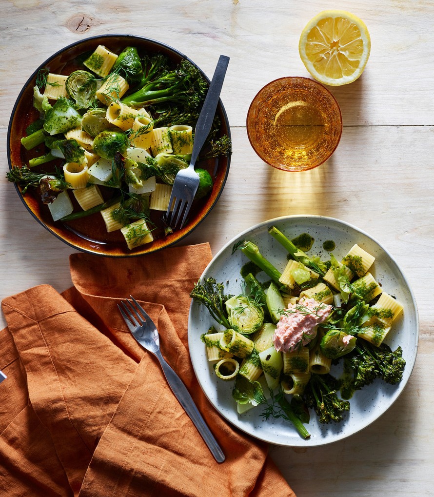 Valuta pasta ja kääntele joukkoon paahdetut kaalit ja yrttiöljy. Viimeistele tuoreella tillillä ja tarjoa lohitahnan kanssa.