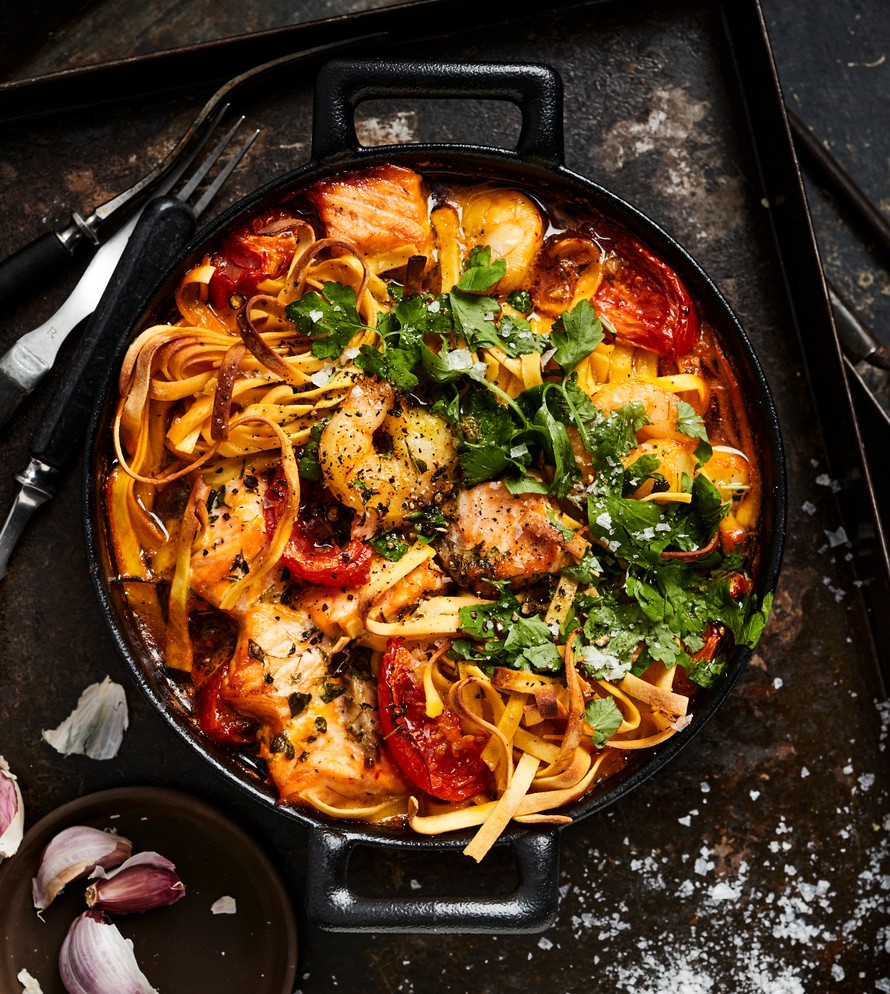 - Sekoita isossa uunivuoassa kasvisliemi, valkoviini, tomaattipyree, suola, sokeri ja sahrami. Lisää kasvikset ja kerälle rullatut nauhapastat. Upota joukkoon lohipalat ja jättikatkaravun pyrstöt. Valuta päälle oliiviöljyä. Kypsennä 200-asteisessa uunissa noin 30 minuuttia.