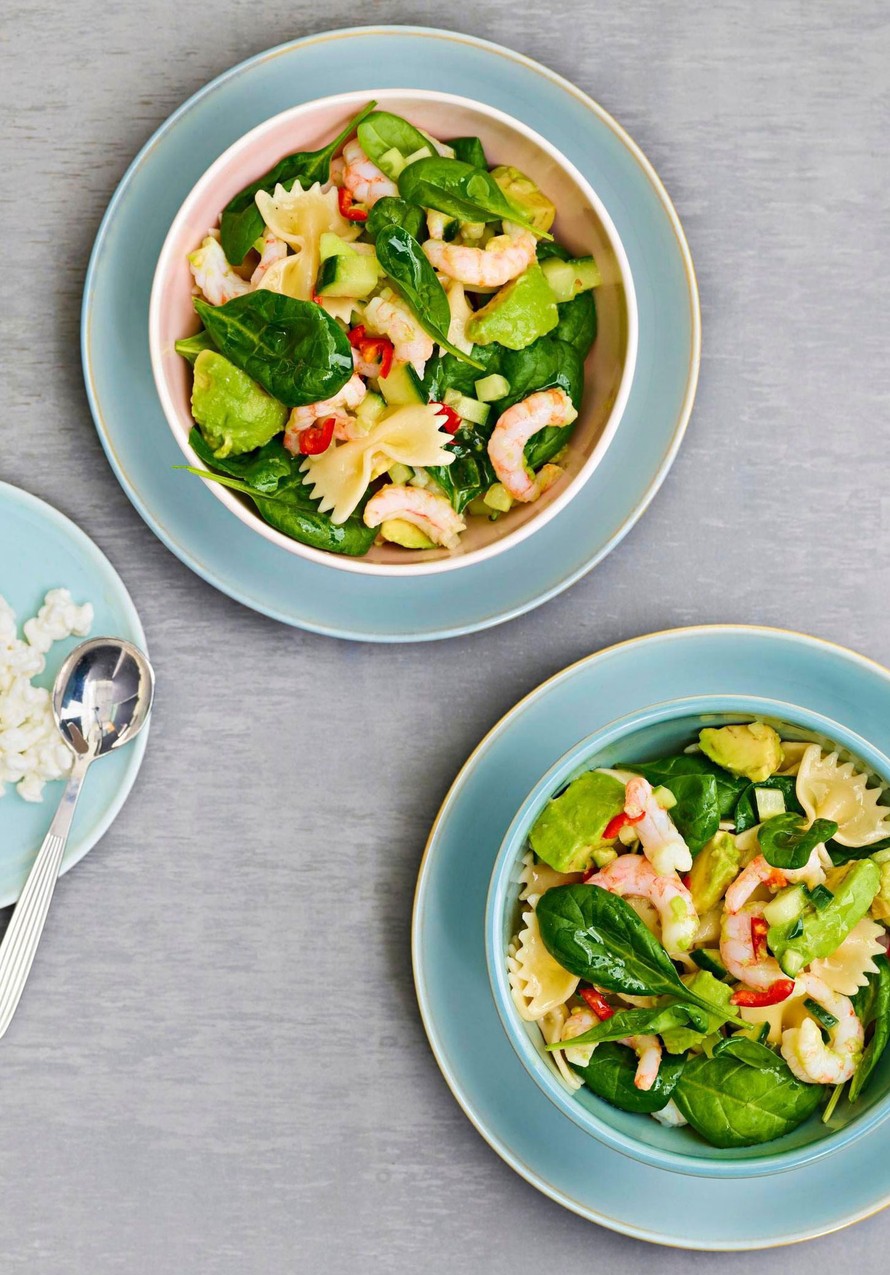 Katkarapupastan esikuva on monille tuttu avokadopasta. Kun hittiruuasta tutut raaka-aineet yhdistetään salaattipinaattiin, katkarapuihin, kurkkuun ja raejuustoon, herkku alkaa lähentyä pastasalaattia.