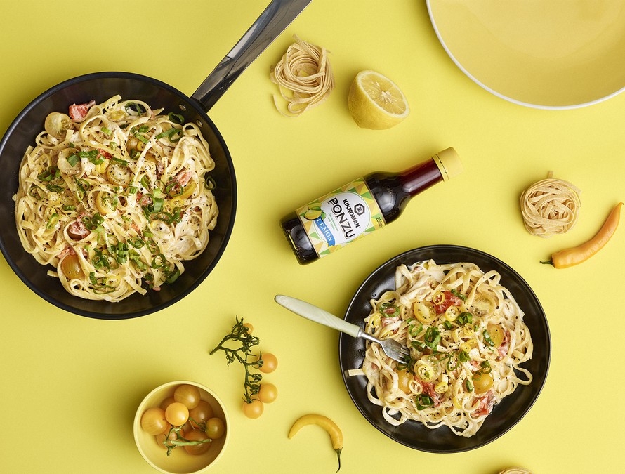 - Lisää kerma, Kikkoman Ponzu-sitrussoijakastike sekä sokeri ja sekoita.