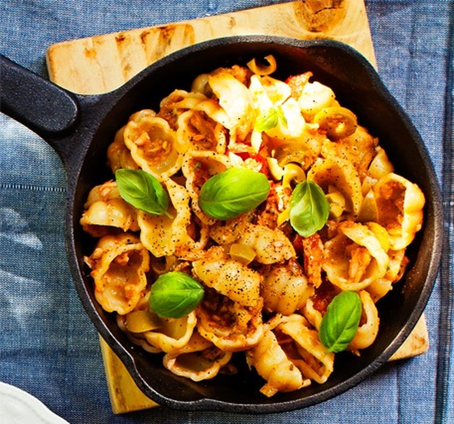 - Lisää tomaatit pannulle sipuleiden kanssa ja hauduta ruokaa 10 minuuttia. Leikkaa oliivit paloiksi ja lisää ne tonni kalan ja peston kanssa kastikkeeseen. Valuta kypsä pasta ja sekoita se joukkoon.