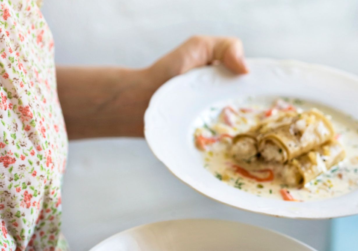 3. Keitä lasagnelevyt runsaassa, suolalla maustetussa vedessä pehmeän napakoiksi. Valuta levyt ja levitä niiden päälle ricottakastiketta. Kääri levyt rullalle lautaselle ja valuta päälle mascarponekastike, johon olet sekoittanut savulohipalat ja kaprikset. Lisää päälle kesäkurpitsa-sipuliseosta ja viimeistele annokset halutessasi mädillä.