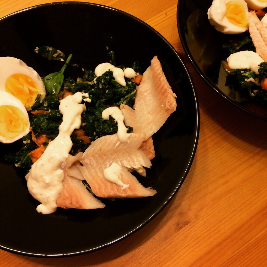 - Putsaa kala. Kuori kananmunat ja puolita ne. Kasaa lautaselle lehtikaalisalaattia kananmunanpuolikkaat ja kalapalat. Roiski päälle kastiketta.