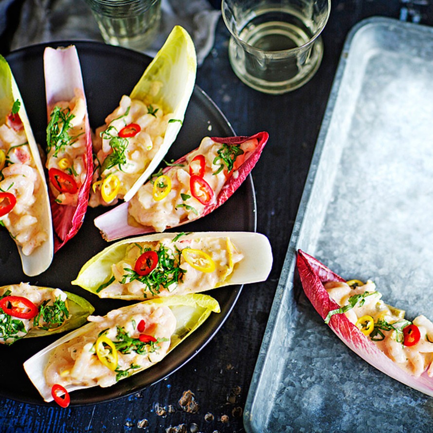 - Poista vaniljatanko kastikkeesta. Raasta appelsiinin kuori joukkoon. Mausta kastike suolalla ja pippurilla. Lisää kurkun- ja tomaatinpalat. Purista ravuista neste huolellisesti ja sekoita täytteeseen.