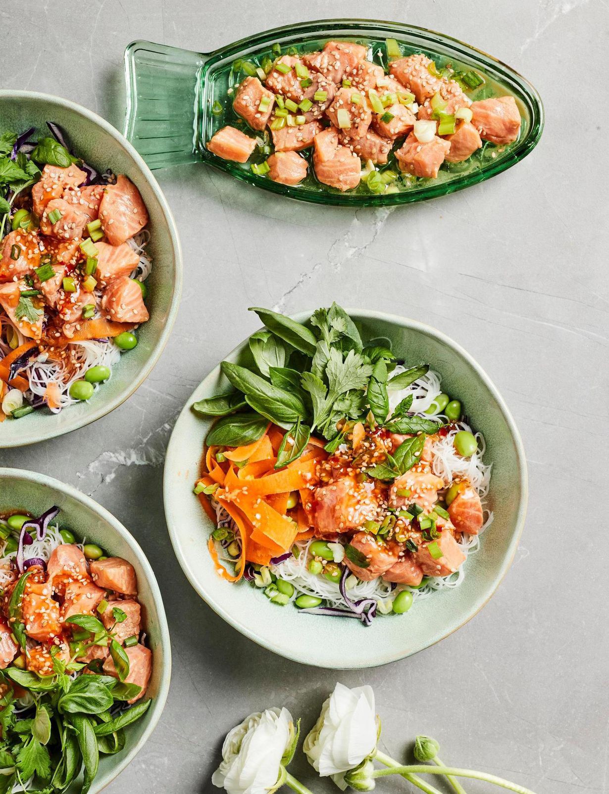 Kokoa nuudeleita, kasviksia, edamame-papuja, lohta ja yrttejä bowl-tyylisiin kulhoihin. Lusikoi chilikastiketta päälle.