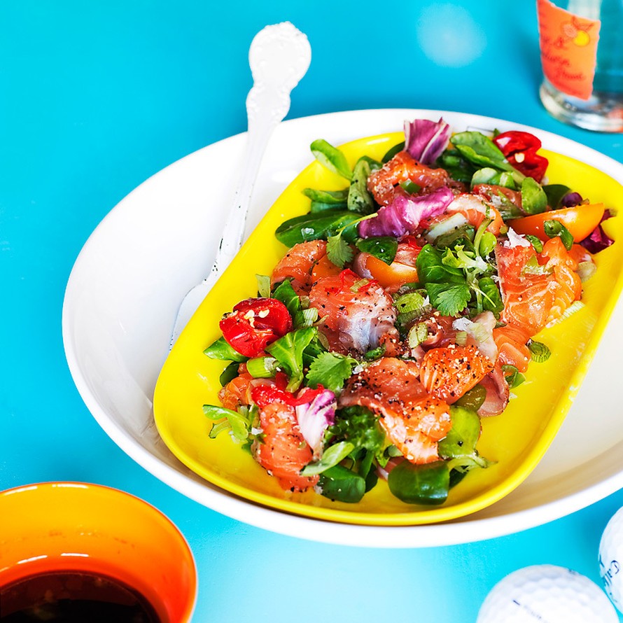 - Viipaloi lohi ohuiksi suikaleiksi ja aseta viipaleet tarjoilulautaselle salaattikerroksen päälle vieri viereen.