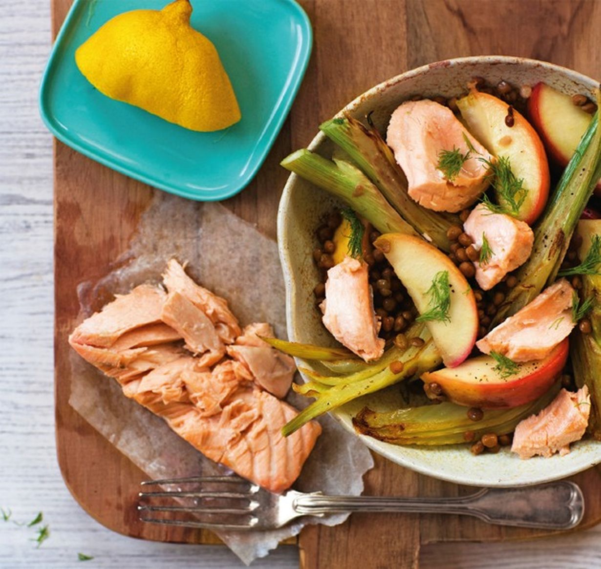 - Purista päälle sitruunan mehu ja mausta suolalla ja pippurilla. Huuhtele linssit juoksevassa kylmässä vedessä ja sekoita ne fenkolin ja omenoiden joukkoon. Nosta lohipalat keitinliemestä ja tarjoa ne fenkolisalaatin kanssa.