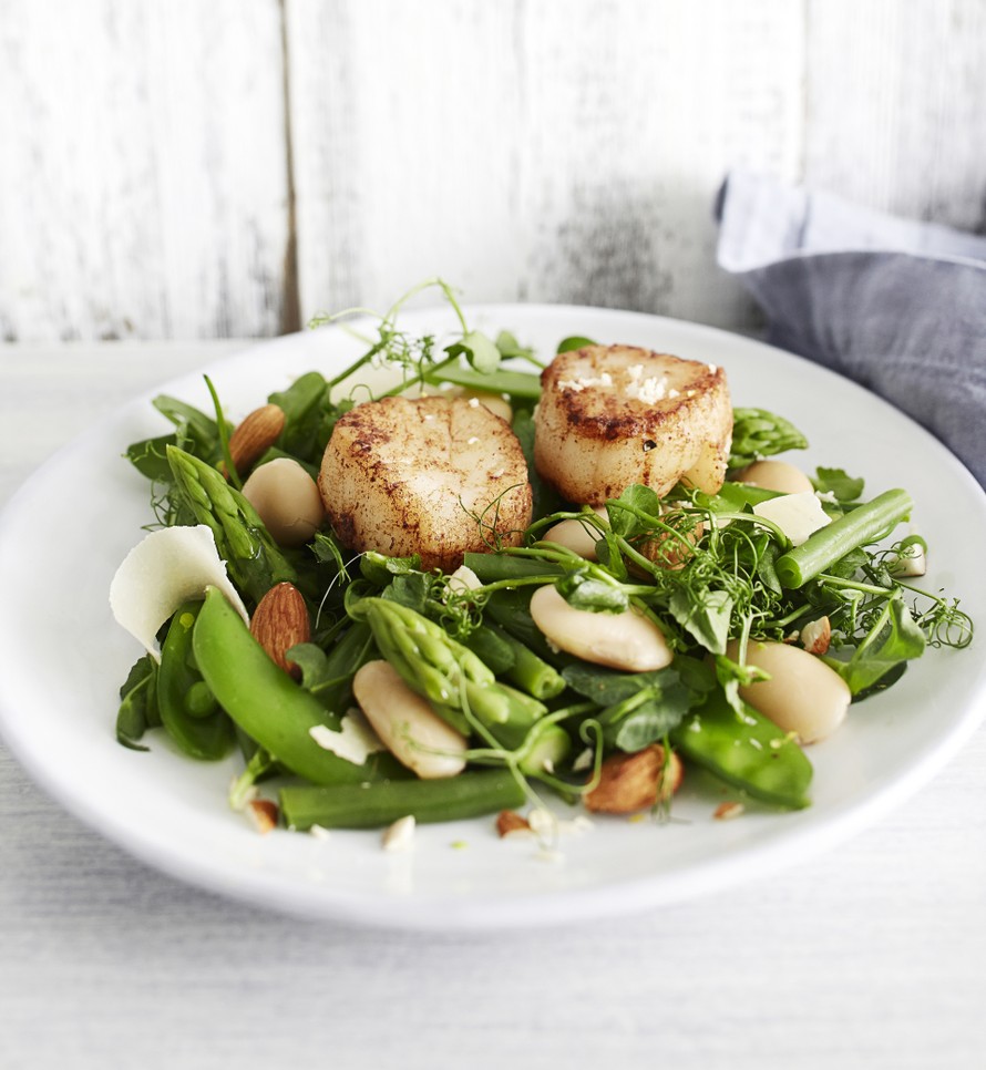 Kevään upeimman alkusalaatin teet parsasta, pavuista, sokeriherneistä ja versoista. Klassiset, lempeät maut herättelevät aterian alkuun.