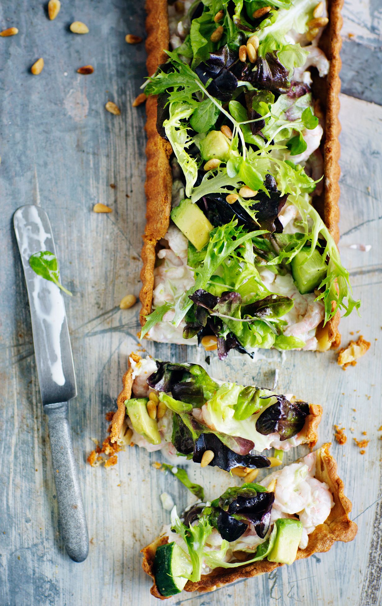 Piiras ja salaatti samassa paketissa! Avokadosalaatti raikastaa katkarapupiiraan.