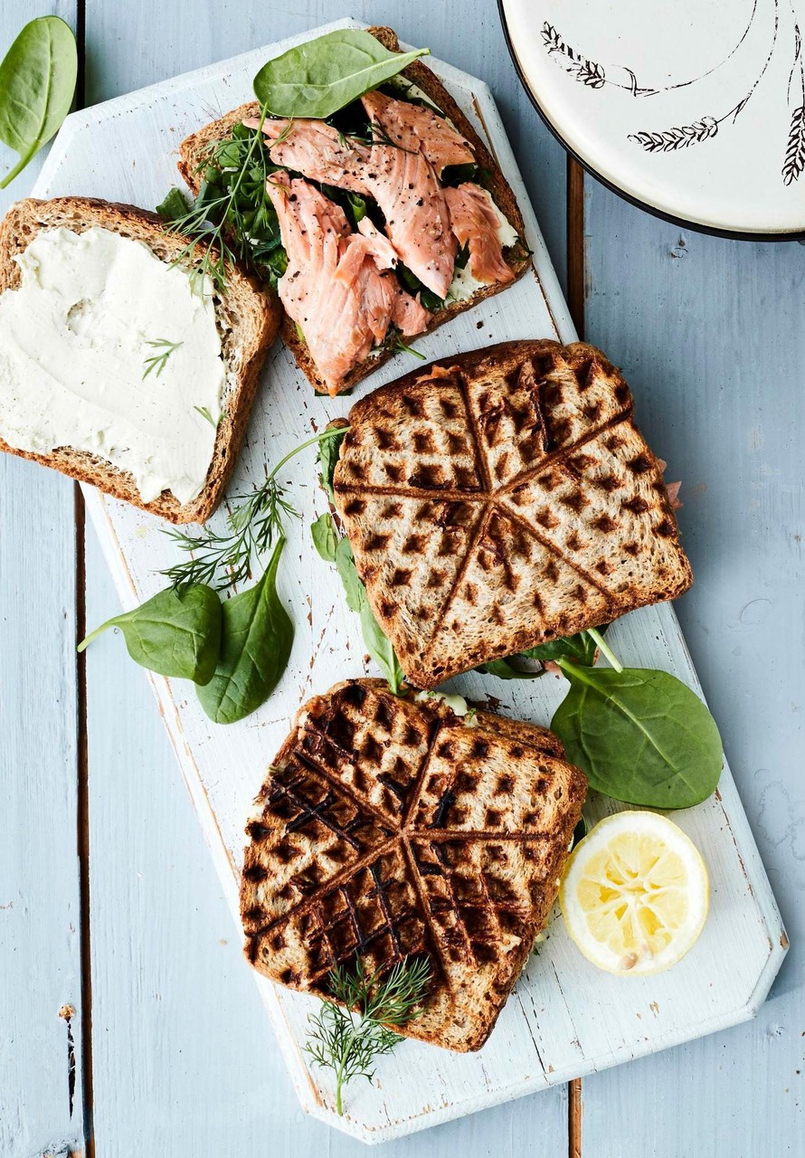 Savukalatoastit valmistuvat kätevästi vohveliraudalla. Niiden salaisuus on simppeli wasabituorejuusto, joka antaa kalalle herkullista potkua.