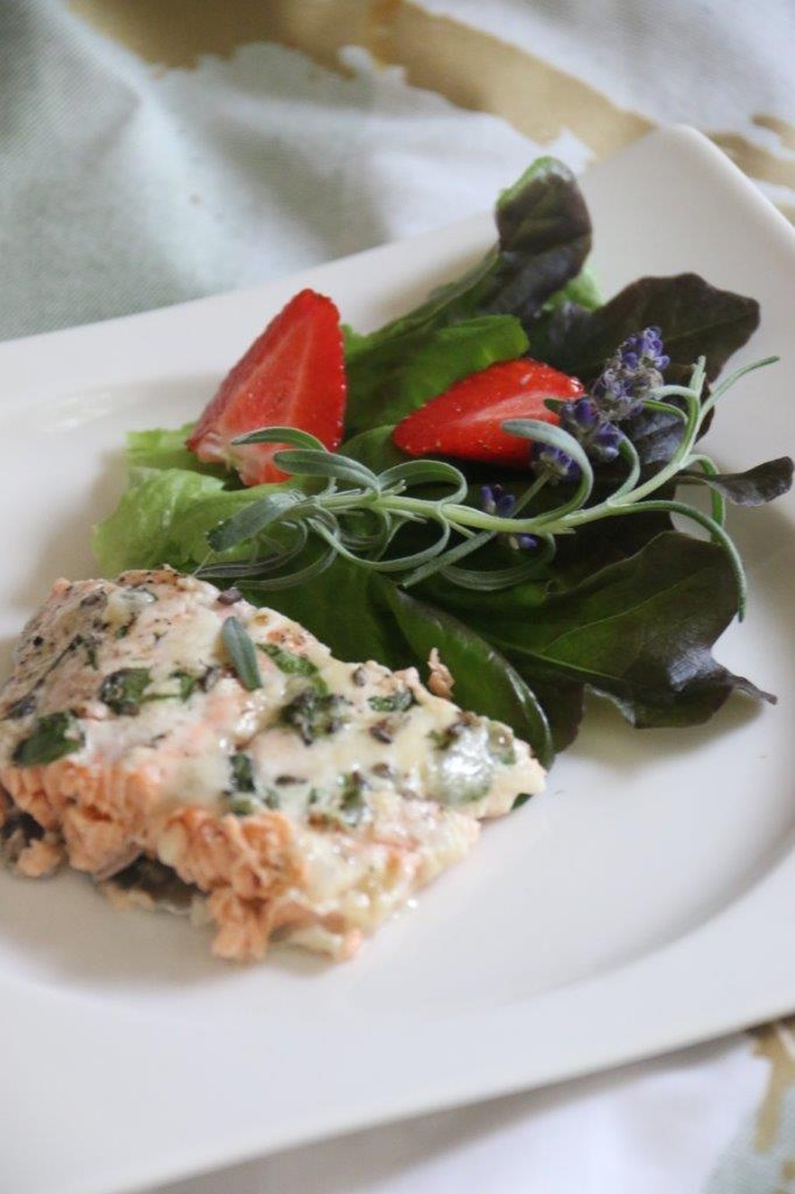 Laventeli on tunnettu tuoksuyrtti, mutta sen kukkainen tuoksu ja maku sopivat myös ruokiin. Laventelinkukat voi kuivata ja niitä voi käyttää sokeriin, hilloihin, leivontaan tai ruoanvalmistukseen. Laventelin lehdet maustavat mainiosti rosmariinin tapaan. Niissä on eksoottinen aromi. Järvikylän laventelin lisäksi käytin lohessani itse kuivaamiani laventelinkukkia.