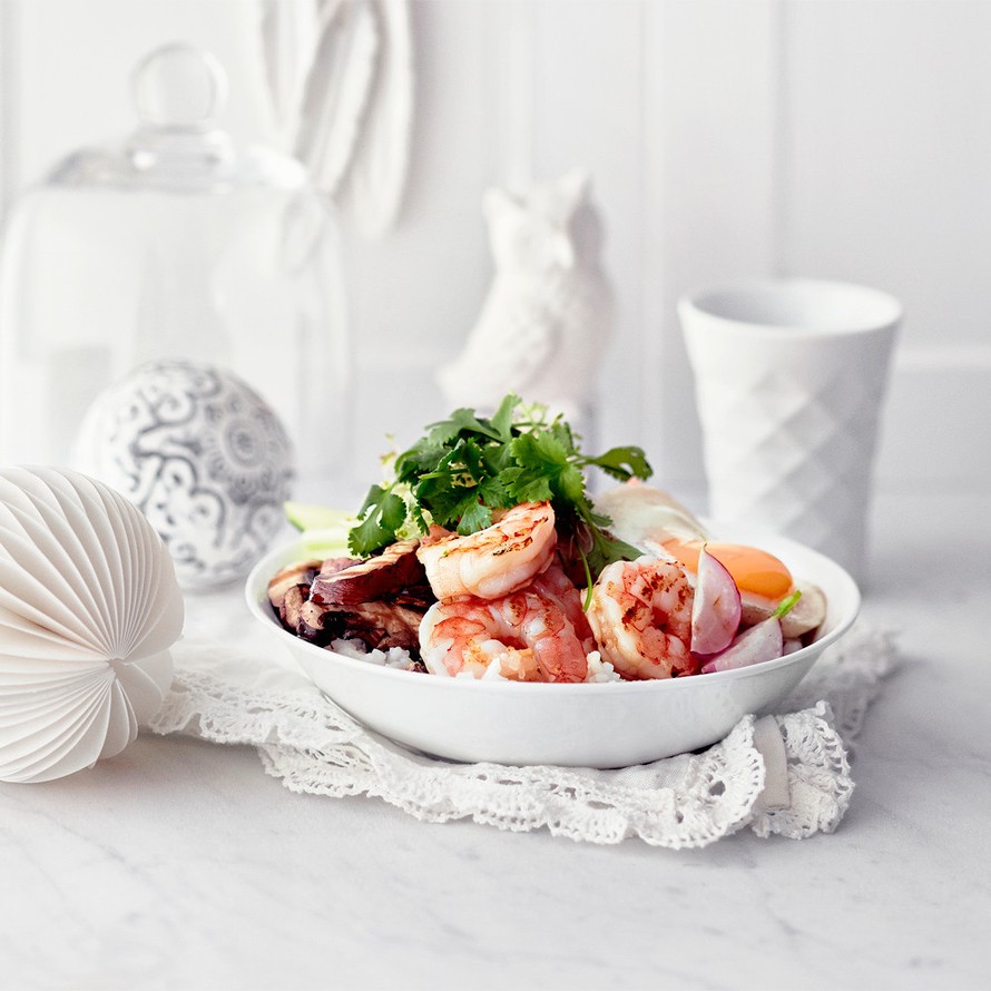 Korealaisessa bibimbapissa riisi saa rinnalleen tuoretta kurkkua, suikaloitua porkkanaa ja katkarapuja.