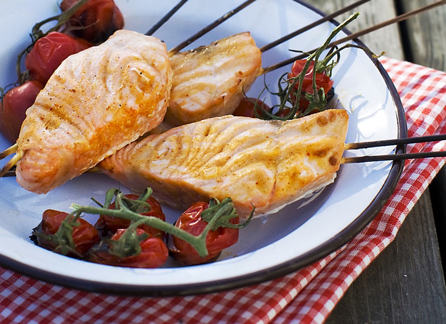 - Pujota palat liotettuihin varrastikkuihin. Grillaa hyvin öljytyllä parilalla kypsiksi eli kalapalan paksuudesta riippuen noin 1–2 minuuttia molemmin puolin. Mausta suolalla ja pippurilla ja tarjoa heti. Voit pirskotella päälle hieman sherryviinietikkaa tarjotessa.