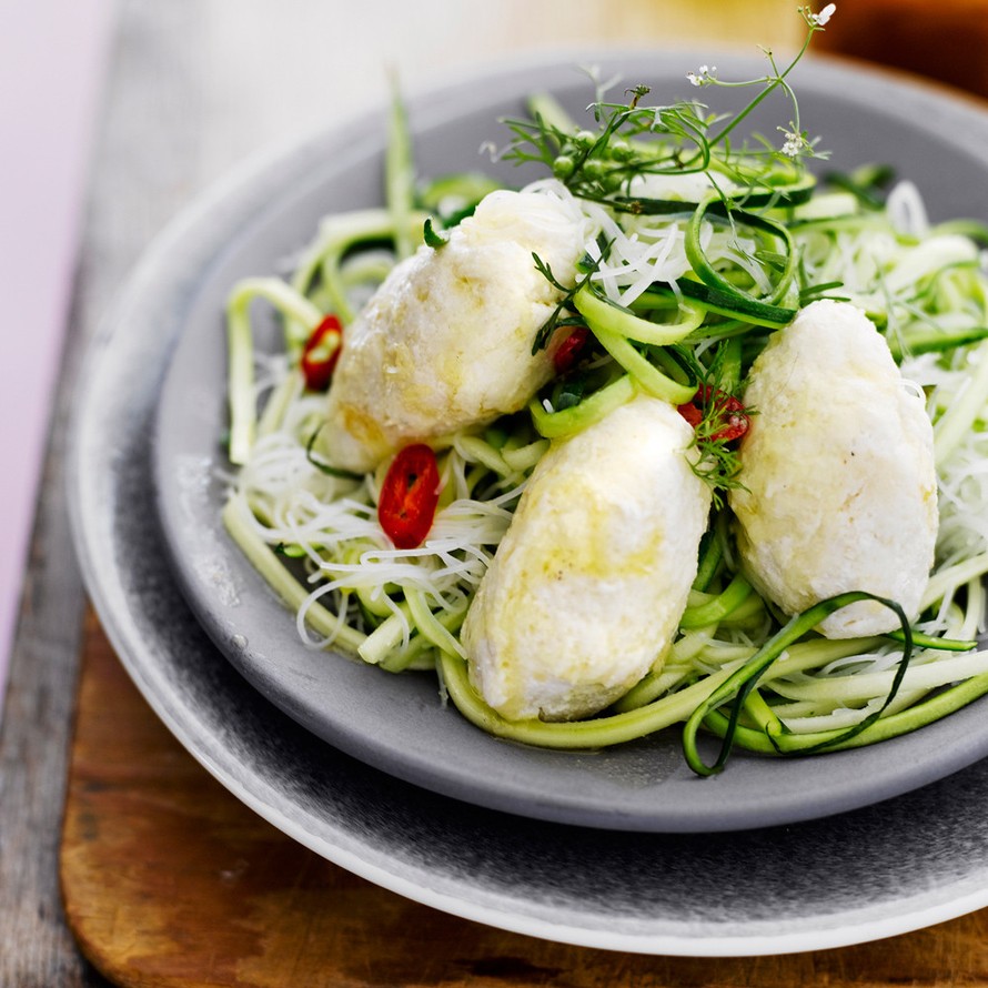 Hauki-inkivääripullat ja kesäkurpitsa-vermiselli