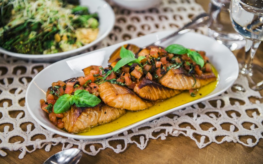 Evelinan Vain elämää -päivänä Satulinnassa syödään hiillostettua lohta, jossa maistuvat mehevät tomaatit, oliiviöljy ja basilika.