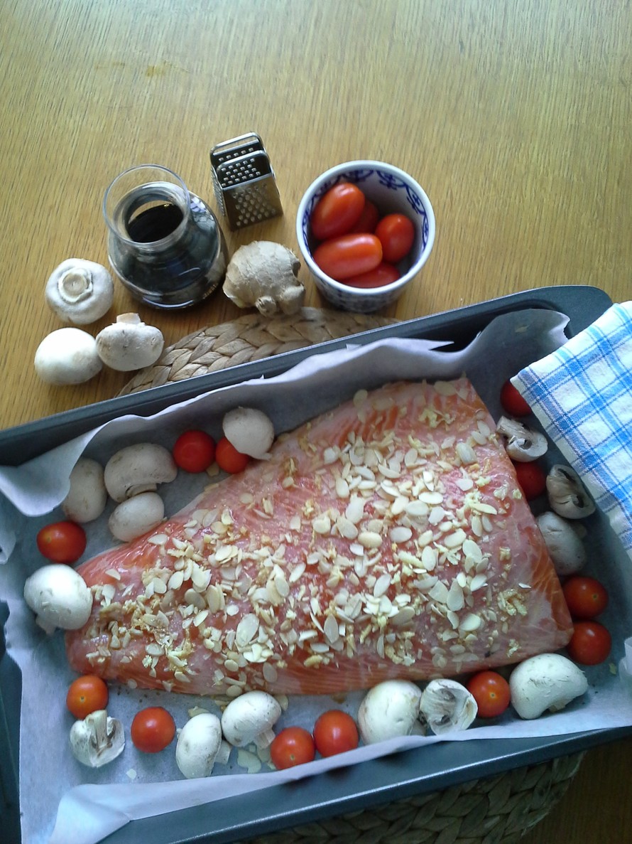 Lohifileen päälle raastetaan runsaasti tuoretta kuorittua inkivääriä. Hiero inkivääri pintaan kiinni. Pirskottele lohen päälle hieman soijaa ja ripottele runsaasti mantelilastuja. Kaada kookoskerma varovasti pintaan ja lisää vuokaan sieniä ja tomaatteja hautumaan kermassa. Laita lohi uuniin 175 asteeseen.