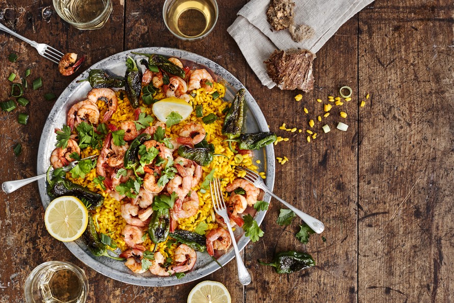Sharing eli jakaminen on hauska tapa syödä yhdessä kaikki lusikoiden samasta padasta. Hauskinta se on hyvässä seurassa ystävien kesken. Herkullinen ja helppo paella valmistetaan kalaliemeen ja valkoviiniin ja maustetaan sahramilla. Päälle ripotellaan iso kasa pannulla paahdettuja jättikatkarapuja.