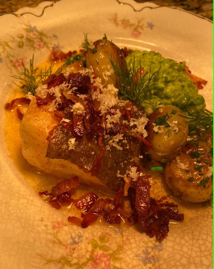 Pekonivoissa herkulliseksi paistettu turska muistuttaa hieman joulun perinneherkkua lipeäkalaa. Lisukkeeksi sopivat paistetut perunat ja hernemuusi.