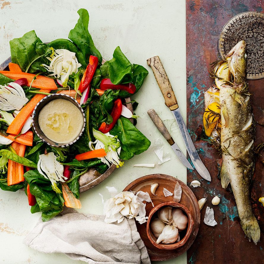 - Käsittele sillä välin kasvikset: Kuori porkkanat. Viipaloi ne, fenkoli, parsakaali ja retiisit jääveteen. Suikaloi paprika. Huuhtele mangoldinlehdet. Siivilöi vihannekset ja mausta oliiviöljyllä ja sormisuolalla.