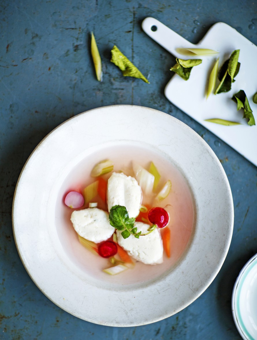 Kuhapullat ja kasviskimara sitruunaruoholiemessä