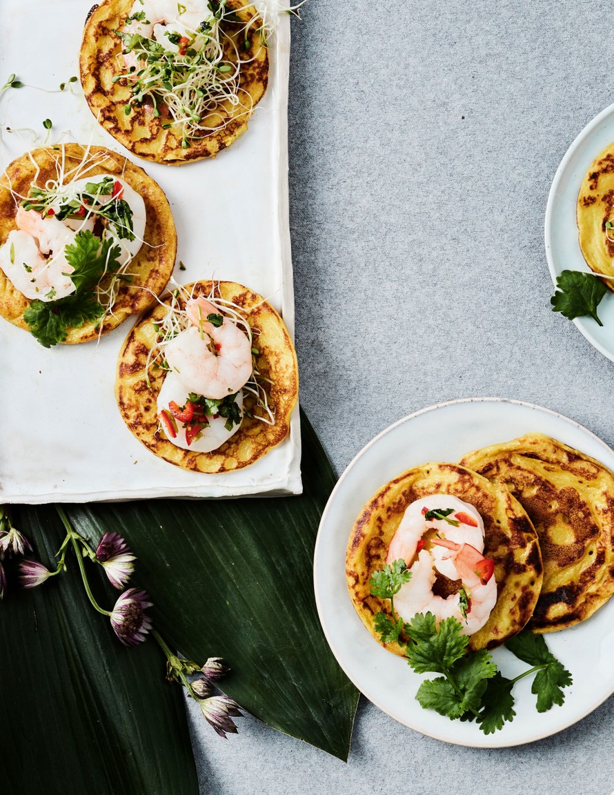 Somat kurkumaletut, jotka lastataan chilimarinoiduilla ravunpyrstöillä, sopivat täydellisesti brunssille tai alkupaloiksi.