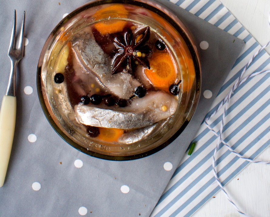 - Lado silli, porkkana- ja inkivääripalat sekä sipuli kerroksittain lasipurkkiin. Kaada päälle jäähtynyt liemi.