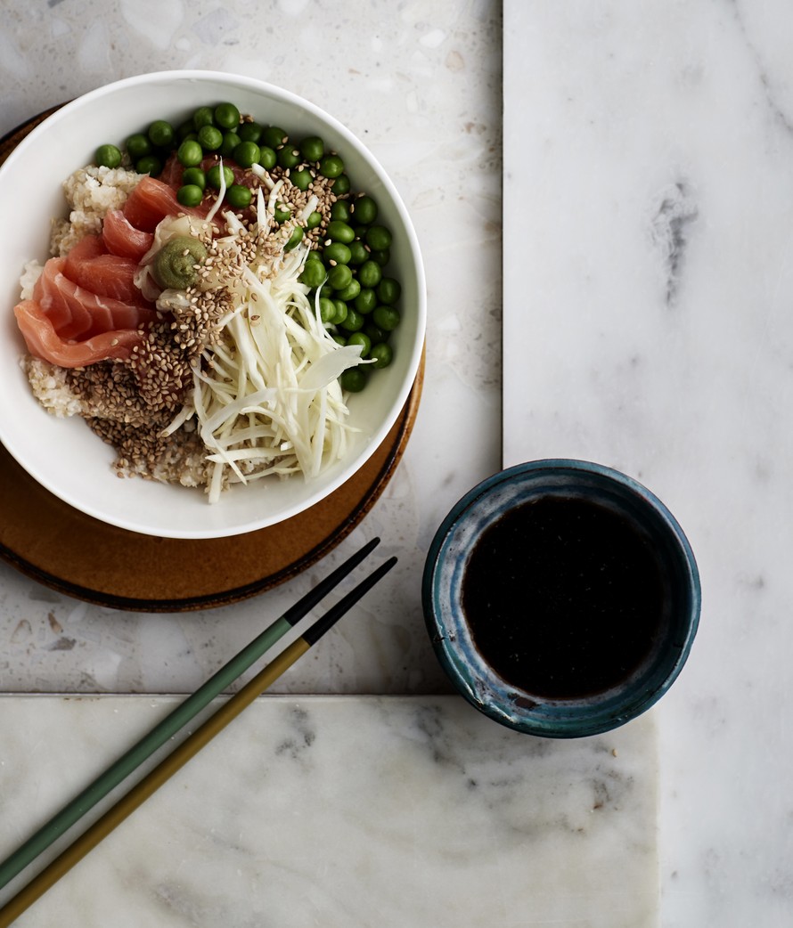 - Mausta kypsä kukkakaalikvinoa sushi-inkiväärillä ja suolalla. Jaa annoskulhoihin. Asettele lohi, herneet ja kaalisuikaleet annosten päälle. Ripottele siemenet pinnalle.