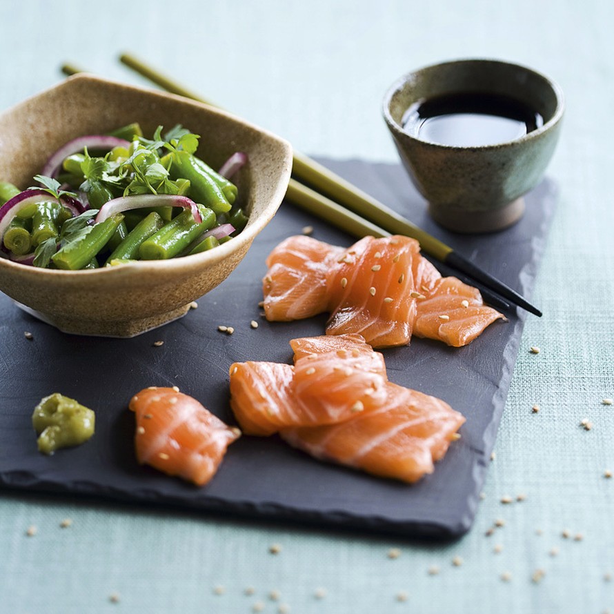 Lohisashimi ja papusalaatti
