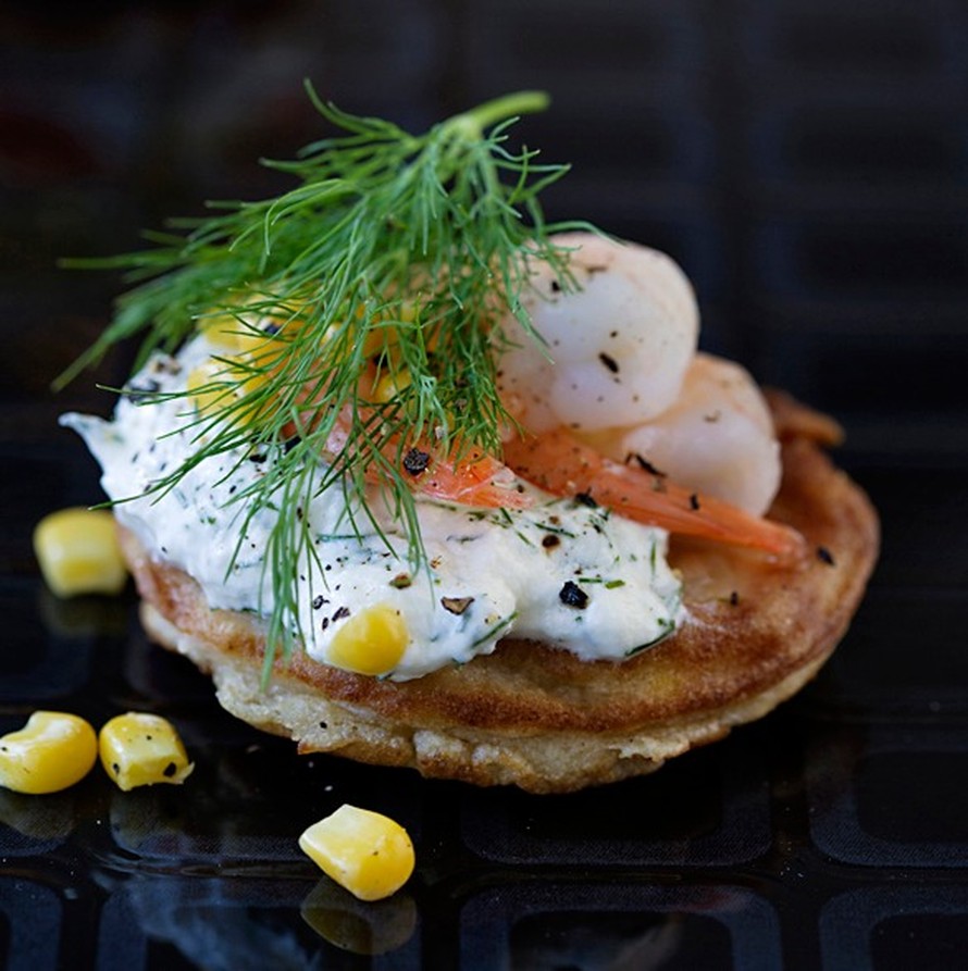- Paista taikinasta keskilämmöllä pienellä lettupannulla rasvassa kullanruskeita, paksuhkoja lettuja. Pidä lämpiminä. Sekoita kermaviilii, silputtu tilli, sitruunamehu ja sitruunakuori. Mausta seos suolalla.