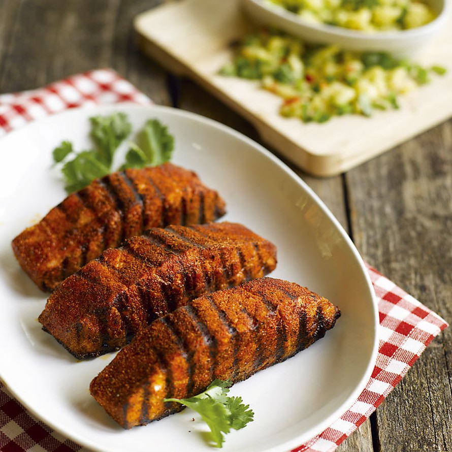 Paistettu lohi saa uuden vivahteen ärhäkästä mausteseoksesta.
