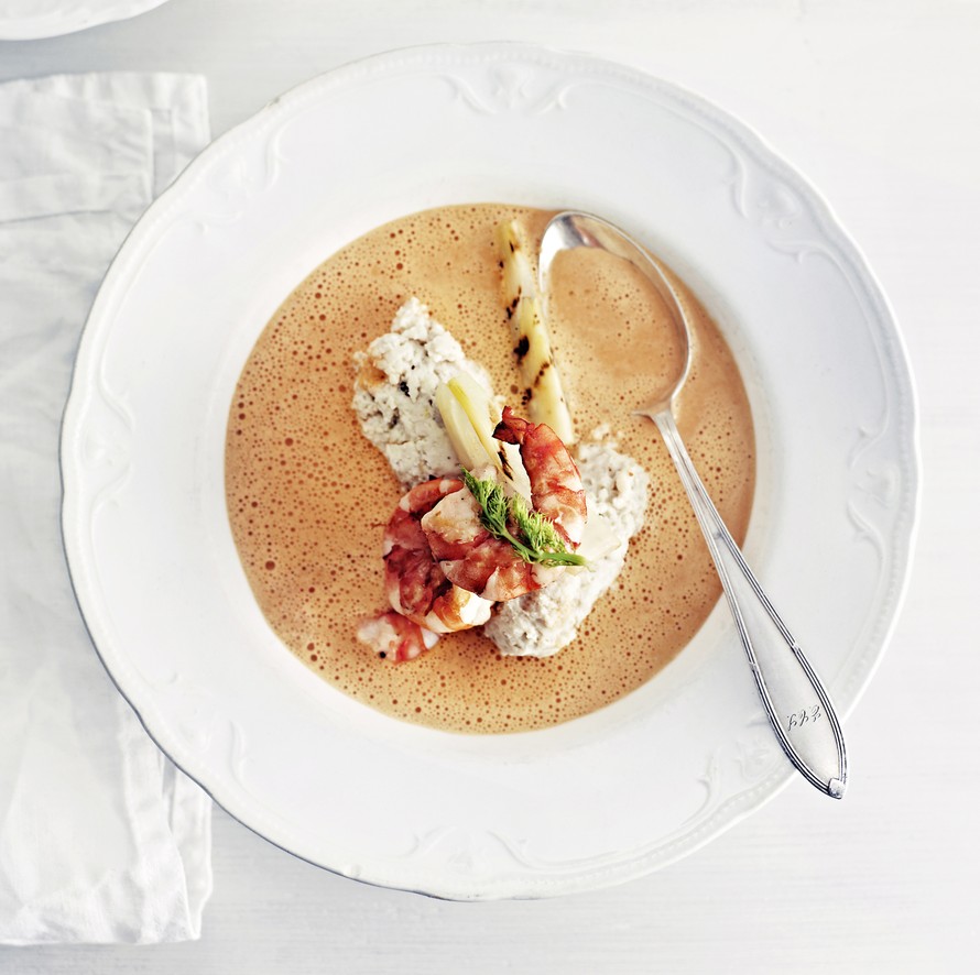 - Kaada kerma joukkoon. Jatka kypsentämistä 10 minuuttia. Poista laakerinlehti ja timjami. Soseuta keitto sauvasekoittimella. Voit vielä siivilöidä liemen, jos haluat erityisen sileää keittoa. Kiehauta, mausta pippurilla ja halutessasi suolalla. Huomoi, että kalaliemi antaa suolaista makua. Tarjoa kvenellien kanssa.
