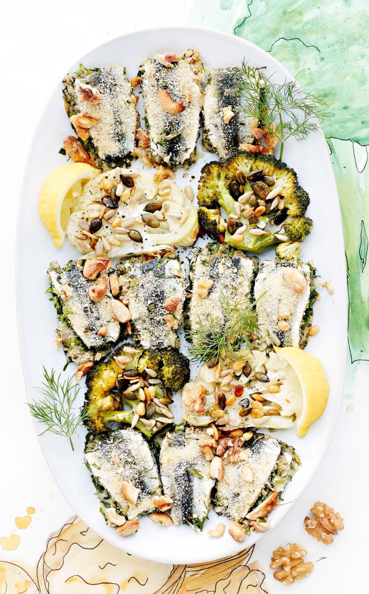 Pähkinäiset silakkapihvit ja paahdetut kaalit