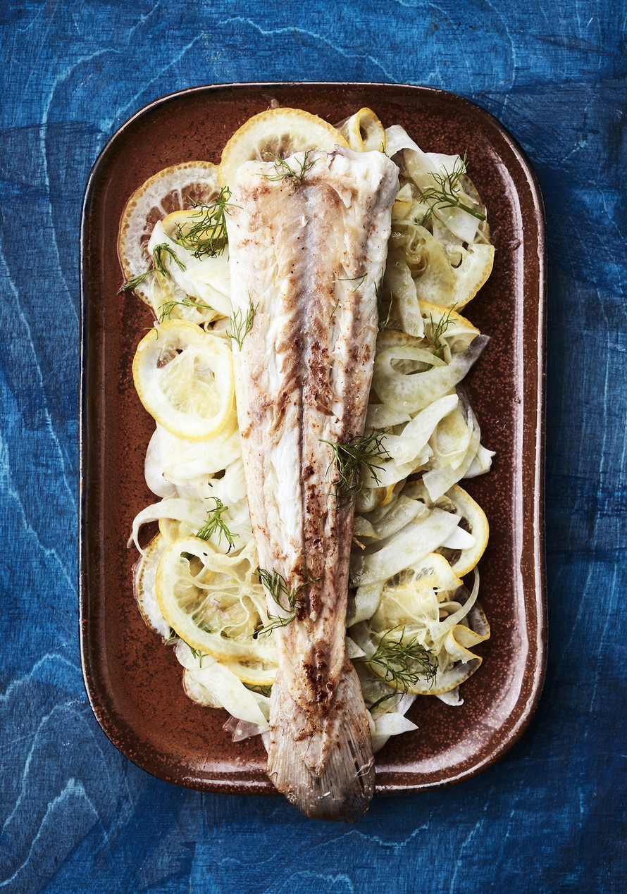 - Tee ensin salaatti. Leikkaa fenkolin sormimaiset tupsut pois. Halkaise fenkoli ja höylää siitä ohuita viipaleita vihannesleikkurilla tai leikkaa viipaleiksi terävällä veitsellä. Leikkaa sitruuna ohuiksi viipaleiksi kuorineen. Ohuen viipaleen kuori pehmenee syötäväksi öljyn kanssa. Lado fenkolit ja sitruunat kerroksittain lautaselle. Valuta väliin öljyä ja mausta suolalla.