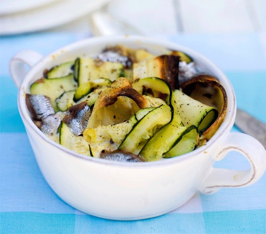 - Paahda pannulla myös kesäkurpitsa- ja palsternakkasiivut pienissä erissä. Valuta anjovikset ja paloittele ne pitkittäin kolmeen osaan. Lado kesäkurpitsaa, palsternakkaa, sipulisilppua ja anjoviksia kerroksittain laakeaan uunivuokaan ja mausta välit kevyesti suolalla ja pippurirouheella.