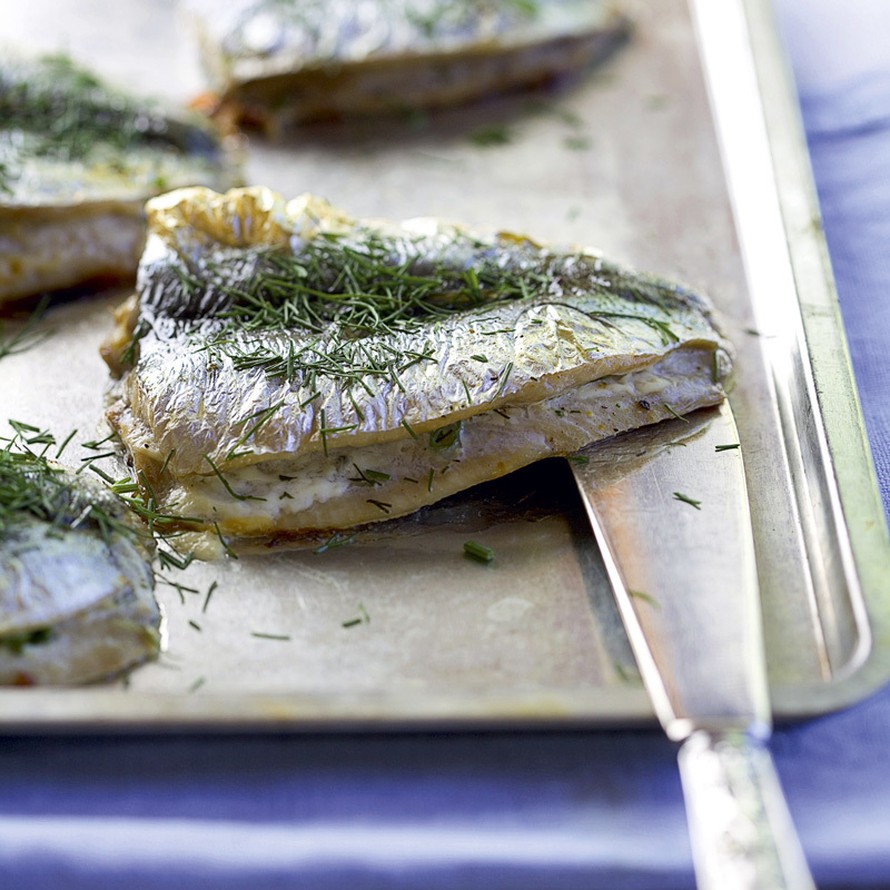 - Levitä puolet silakkafileistä leikkuulaudalle nahkapuoli alaspäin. Voitele fileet ohuesti juustolla. Ripottele päälle yrtit, suola ja pippuri. Peitä kukin filee toisella fileellä ja sivele öljyllä.