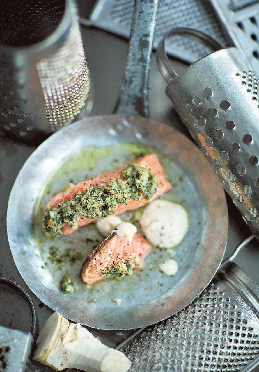 Piparjuuri-juustotahnalla kuorrutettua lohta