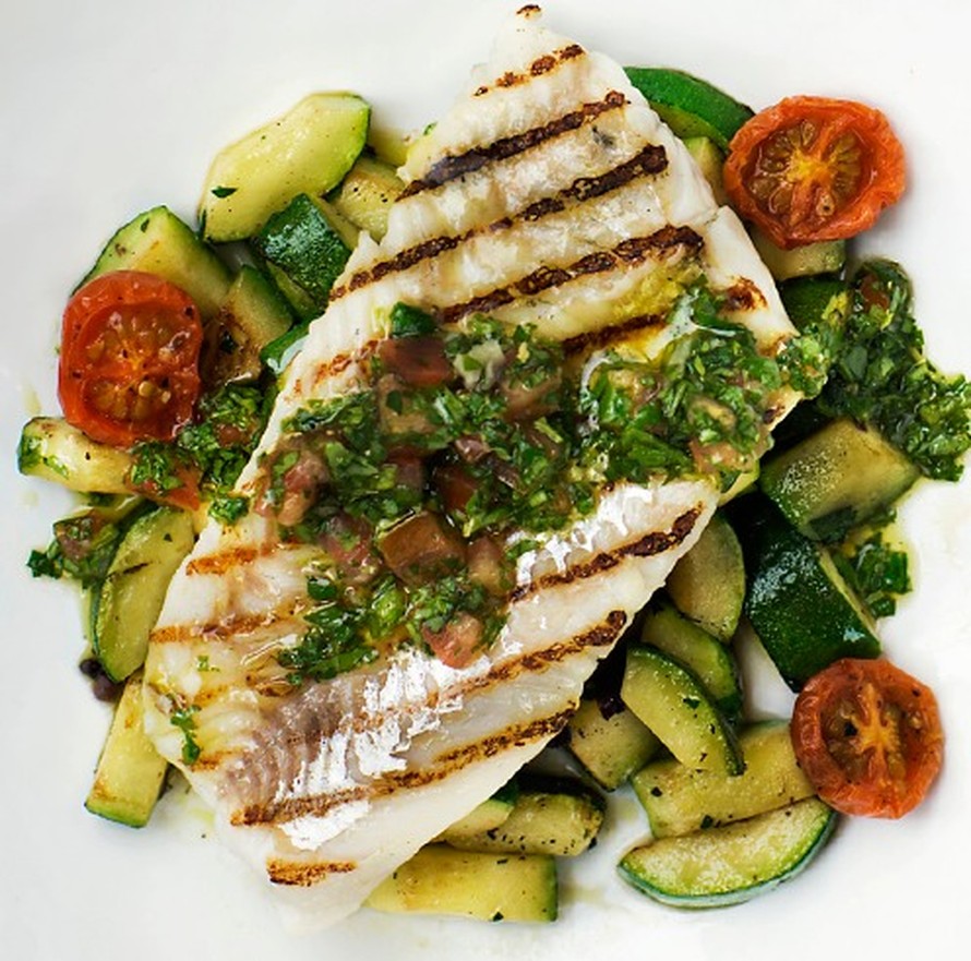 Kalan lisukkeena on kesäkurpitsaa ja yrtti-tomaattikastiketta.