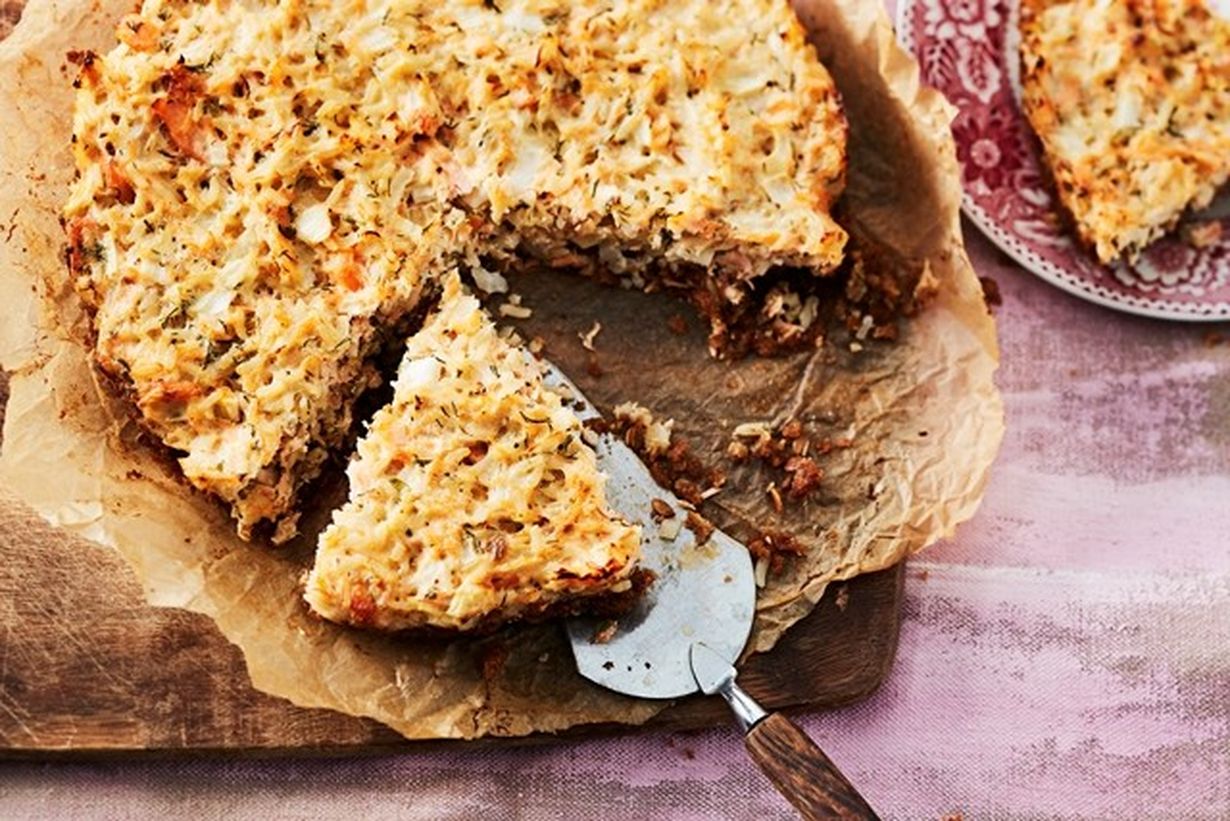 Mehevän lohipiiraan pohja valmistuu käden käänteessä näkkileivästä. Ravitseva ja herkullinen piiras maistuu hyvin vaikka lounaalla.