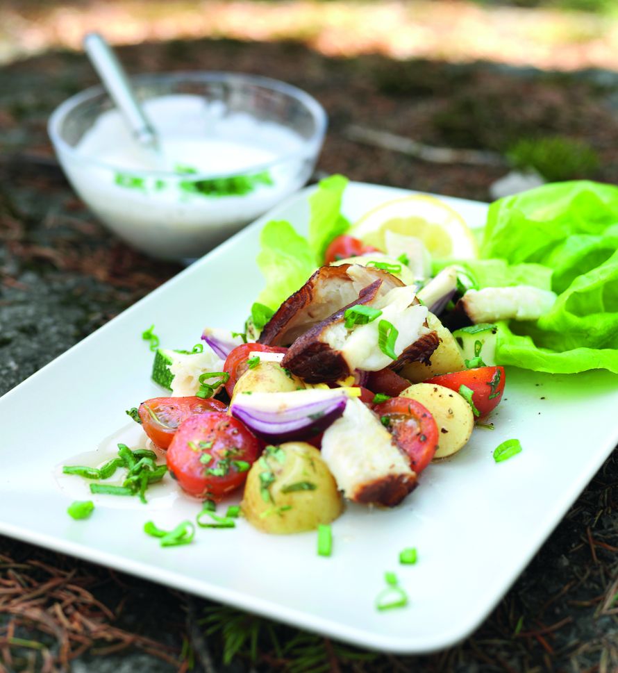Savumakrillia, marinoituja vihanneksia ja jogurttikastiketta