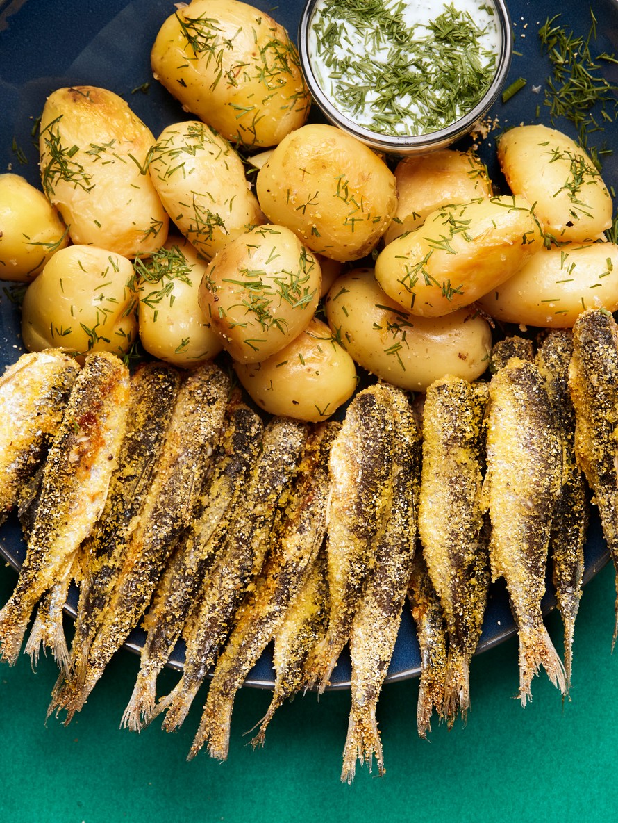 Savun maku tarttuu parhaiten raakoina savustettuihin perunoihin. Polenta korvaa ruisjauhot ja antaa muikuille piristävää väriä.
