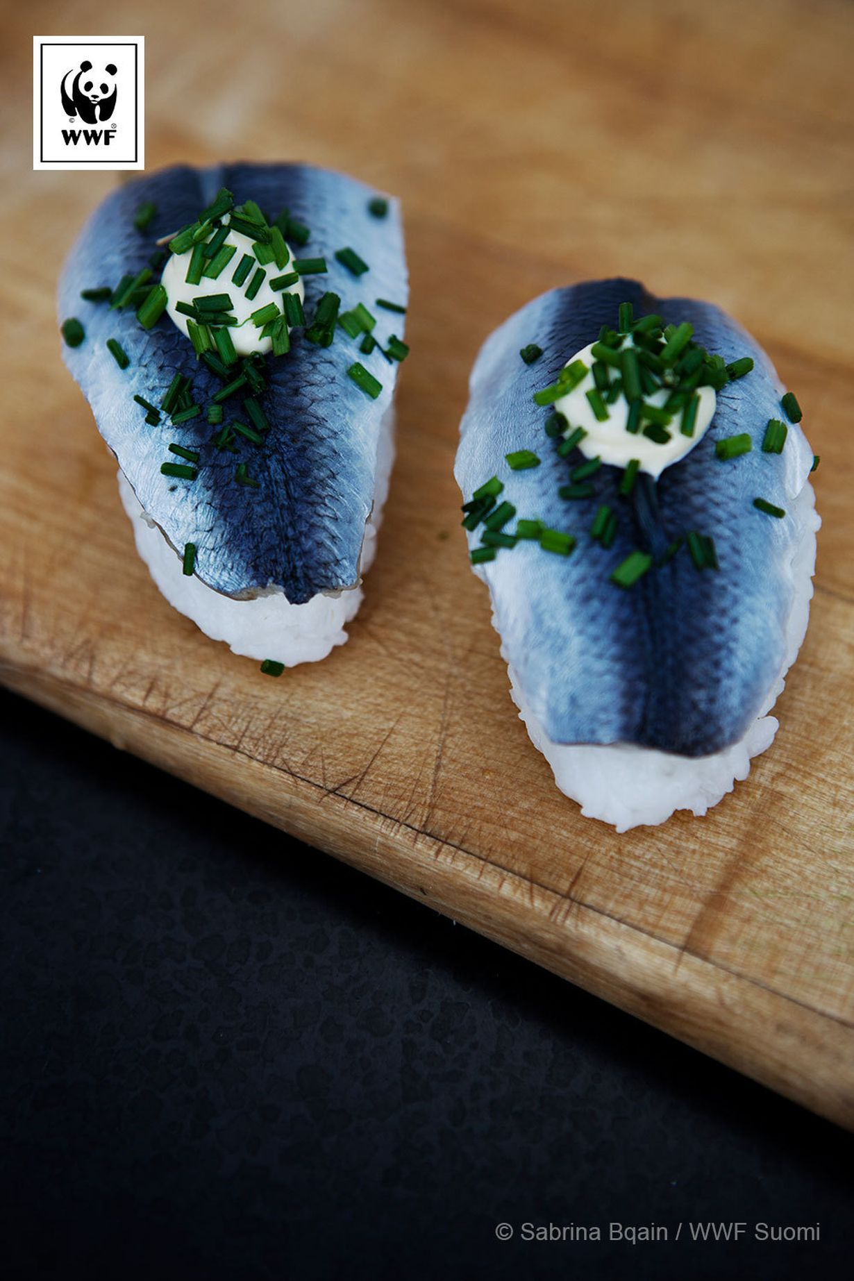 Valmista silakoiden marinadi. Sekoita 1 dl riisiviinietikkaa, 2 dl vettä ja 2 tl suolaa. Anna silakoiden marinoitua jääkaapissa 2-4 tuntia. Muotoile riisistä sopivan kokoinen pitkulainen pallo. Sipaise riisin pintaan vähän wasabia. Aseta päälle silakkafile. Koristele halutessasi majoneesilla ja ruohosipulilla.