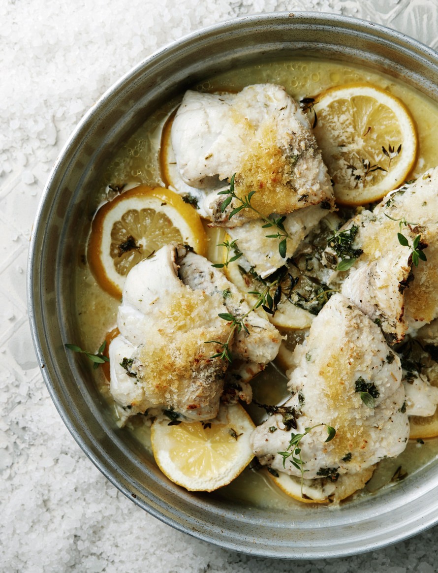 Anna kuhafileiden uida sitruuna-yrttimarinadissa ja nosta sitruunapedillä uuniin. Pinnalle ripotellut pankojauhot viimeistelevät raikkaasti hapokkaan kalan ihanan rapeaksi.