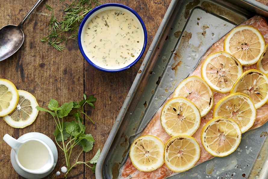 Sitruunainen uunilohi ja yrtti-kermakastike