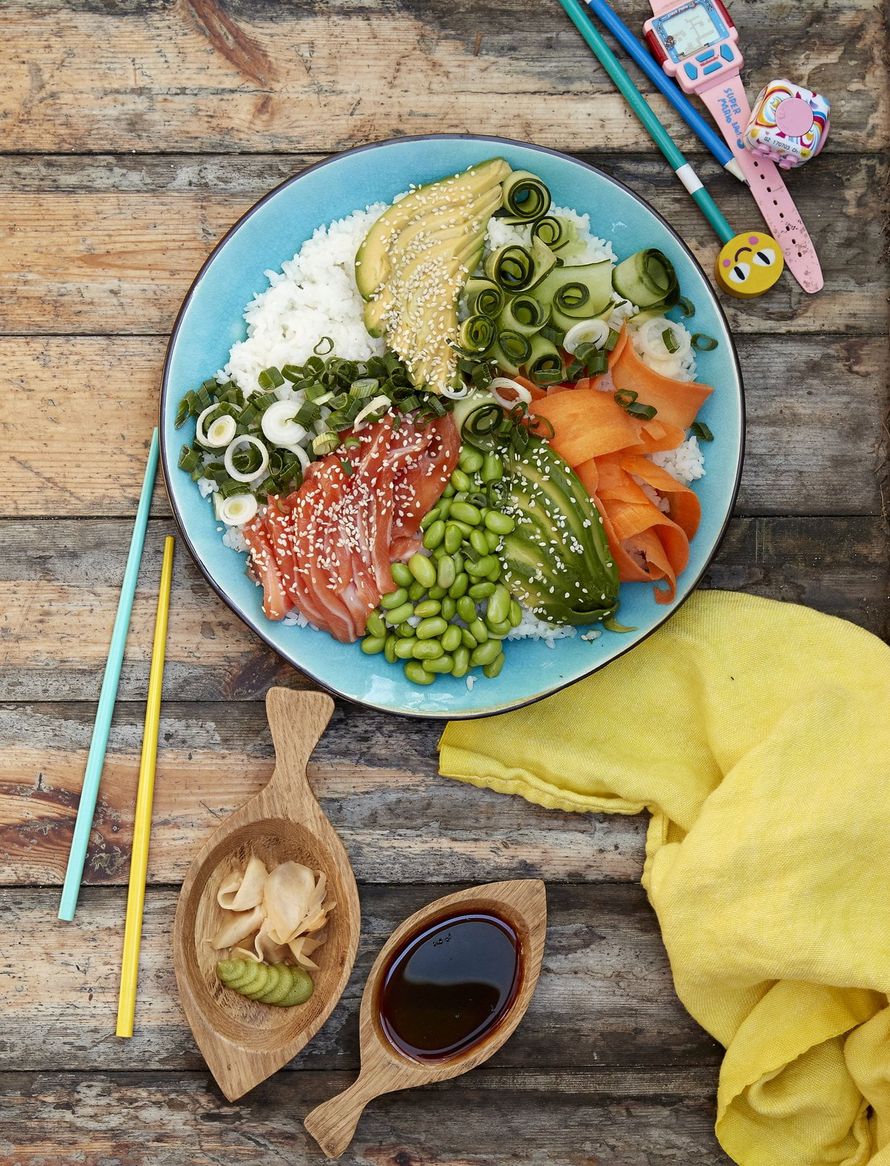 - Levitä jäähtynyt riisi laakeaan tarjoiluastiaan. Asettele riisin päälle lohi, kurkku, porkkana, avokado, kevätsipuli ja edamame-pavut. Ripottele pinnalle seesaminsiemeniä. Tarjoile sushilautanen wasabin, soijakastikkeen ja gari-inkiväärin kanssa.