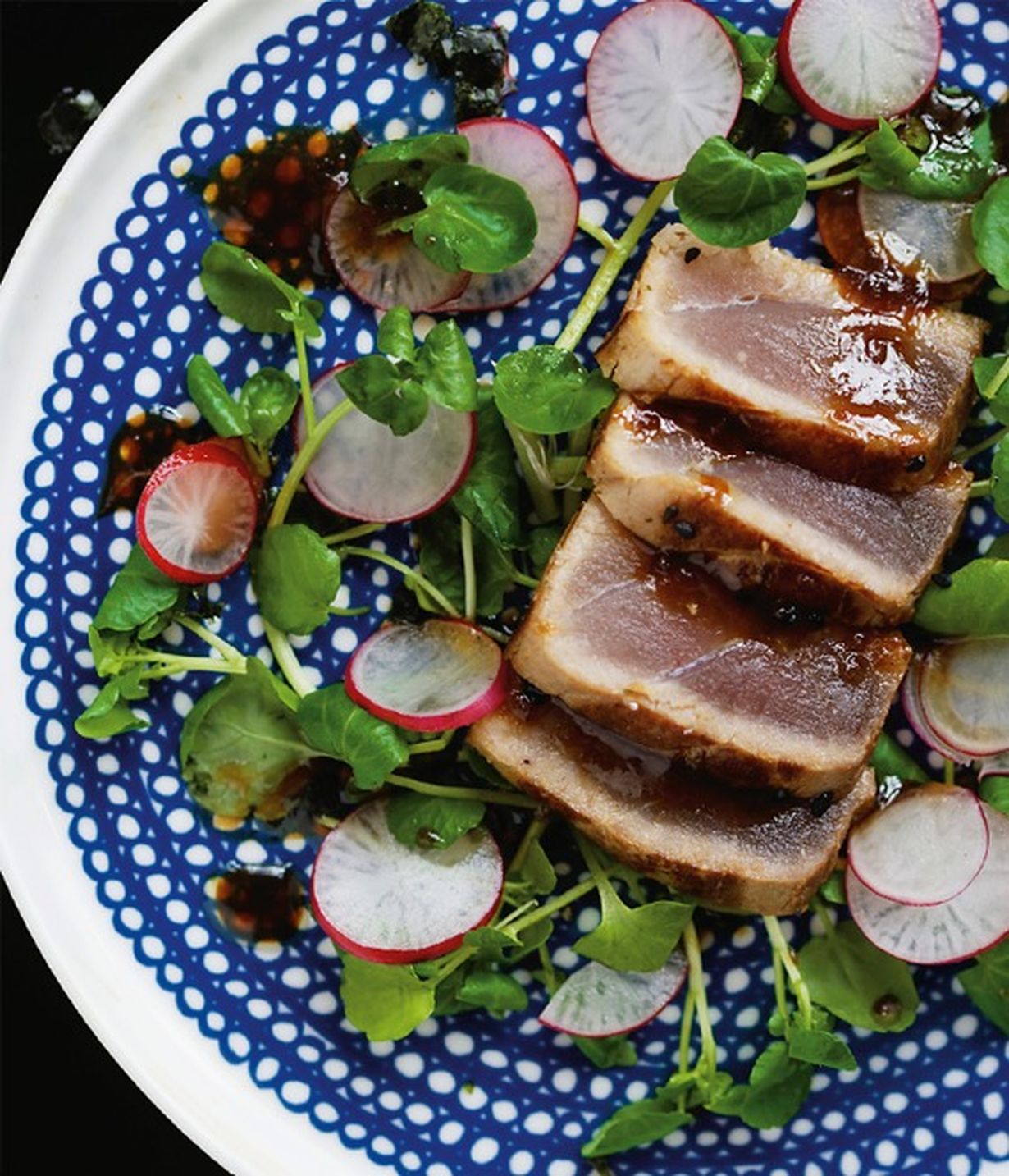 - Yhdistä vesikrassinlehdet ja retiisi, mausta ripauksella suolaa ja laita sivuun. Valmista tataki. Lämmitä pannu kuumaksi. Lisää tonnikala ja paista 30 sekuntia joka kyljeltä. Lisää marinadi pannuun, niin että se peittää tonnikalan.